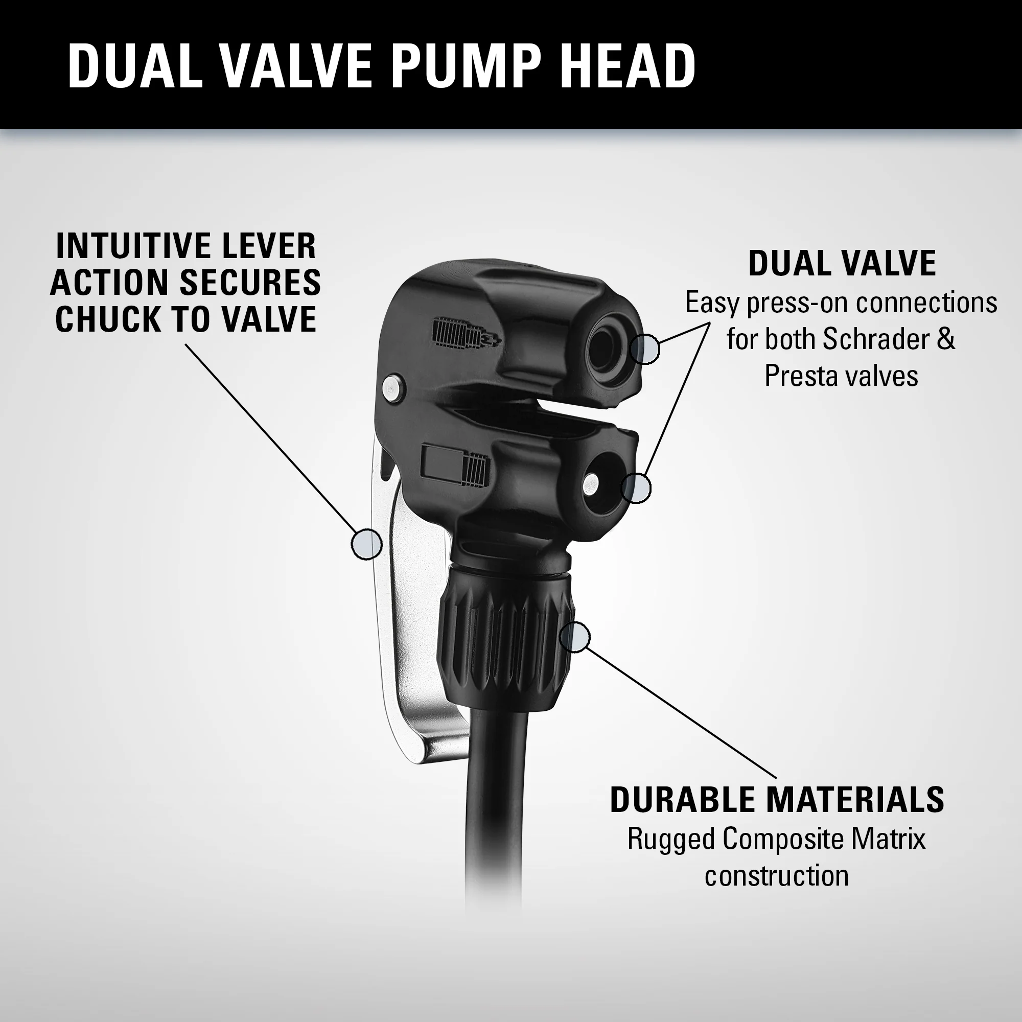 The slip fit Dual Valve Pump Head fits Presta, Dunlop and Schrader valves. It is built from durable Composite Matrix construction and features an ergonomic aluminum locking lever. Rebuildable design.